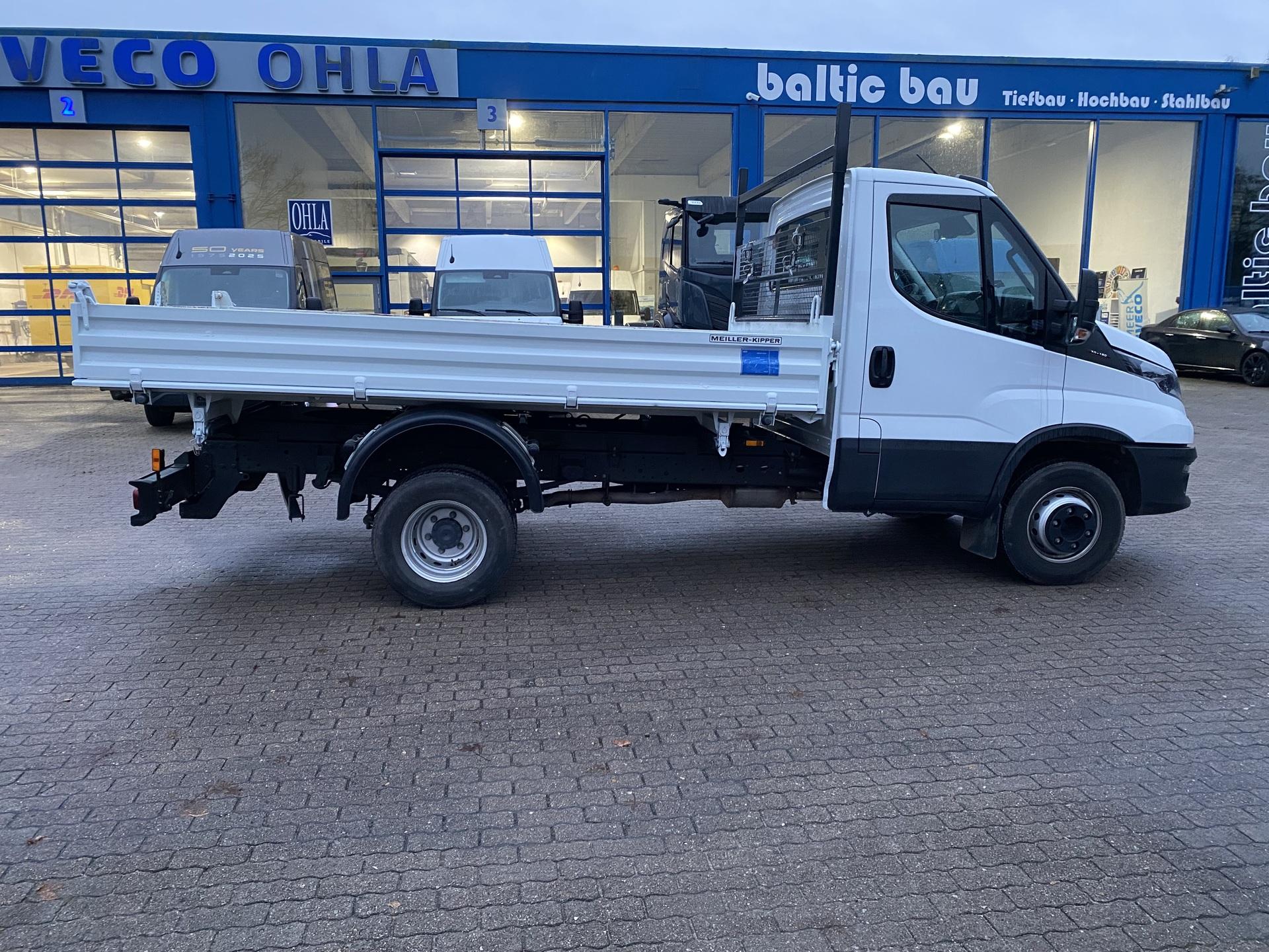 • Meiller Langmaterialträger mit Fahrerhausschutz an der Stirnwand für Daily mit Drei-Seiten-Kipper